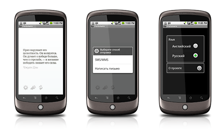 Приложение для чтения самых вдохновляющих высказываний человечества из коллекции сайта Forismatic. Можно отправлять интересные цитаты друзьям по SMS и email. Про любого автора можно почитать в Wikipedia.